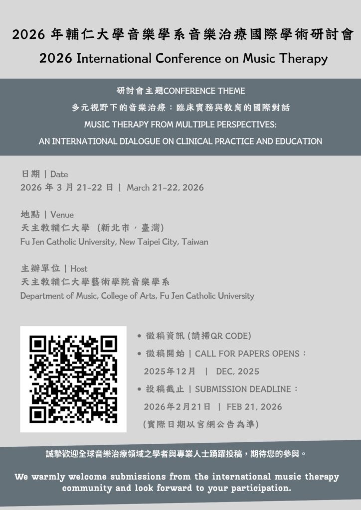 - 促進學術研究交流:整合美國及亞洲各地研究者的成果,進一步強化音樂治療在跨文化情境下的學術討論與理論發展。